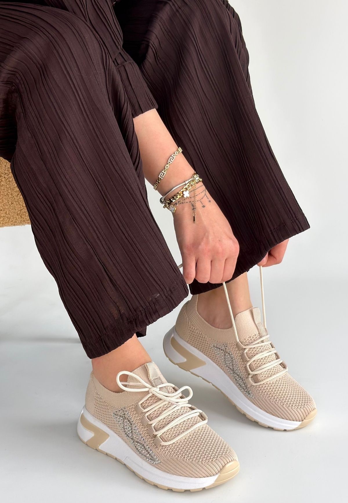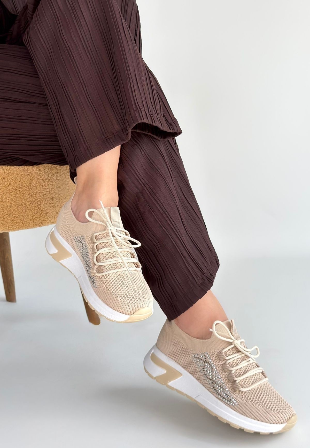 • Belan Bej Triko Bağcıklı Spor Ayakkabı