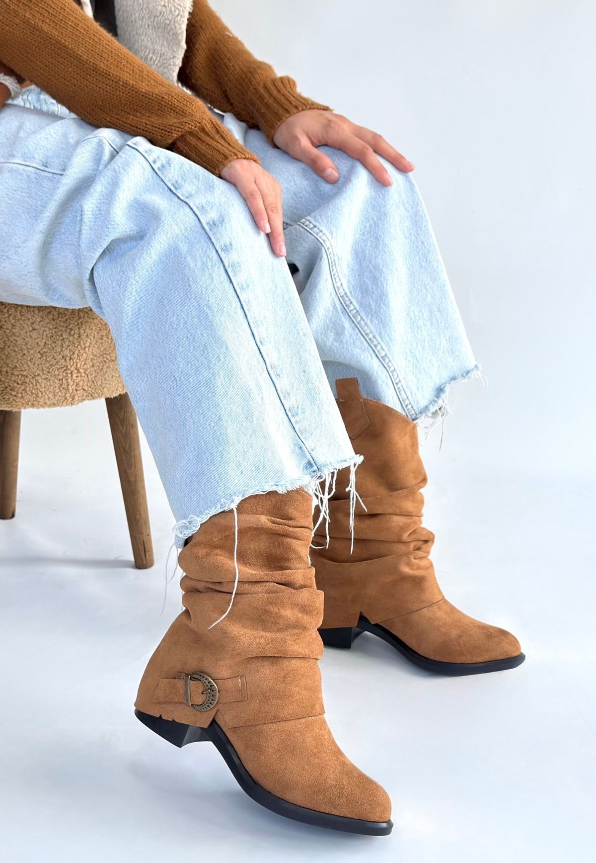• Canty Taba Süet Körüklü Topuklu Çizme