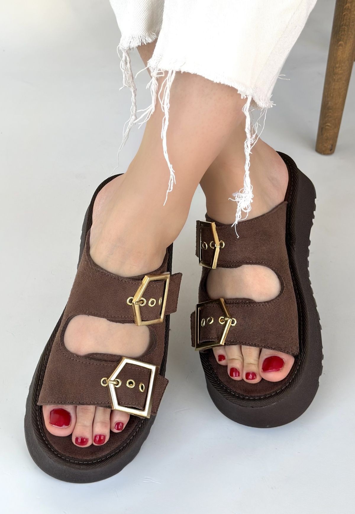 Coer Kahverengi Süet Çift Tokalı Terlik
