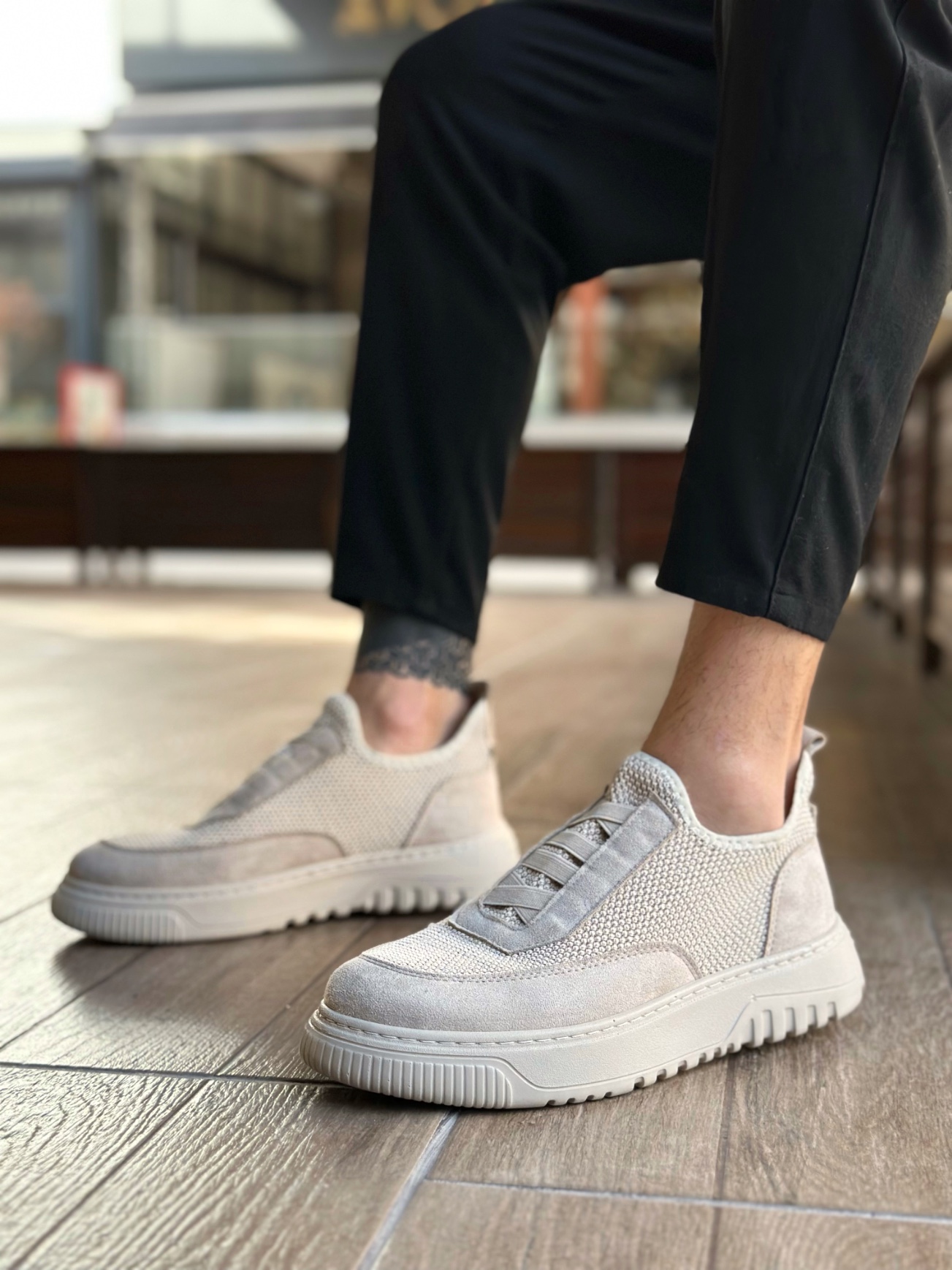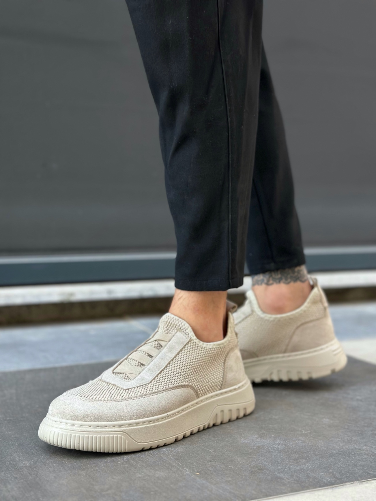 BA0911 Özel Örme Triko Deri Tozu Detaylı Bej Günlük Spor Ayakkabı