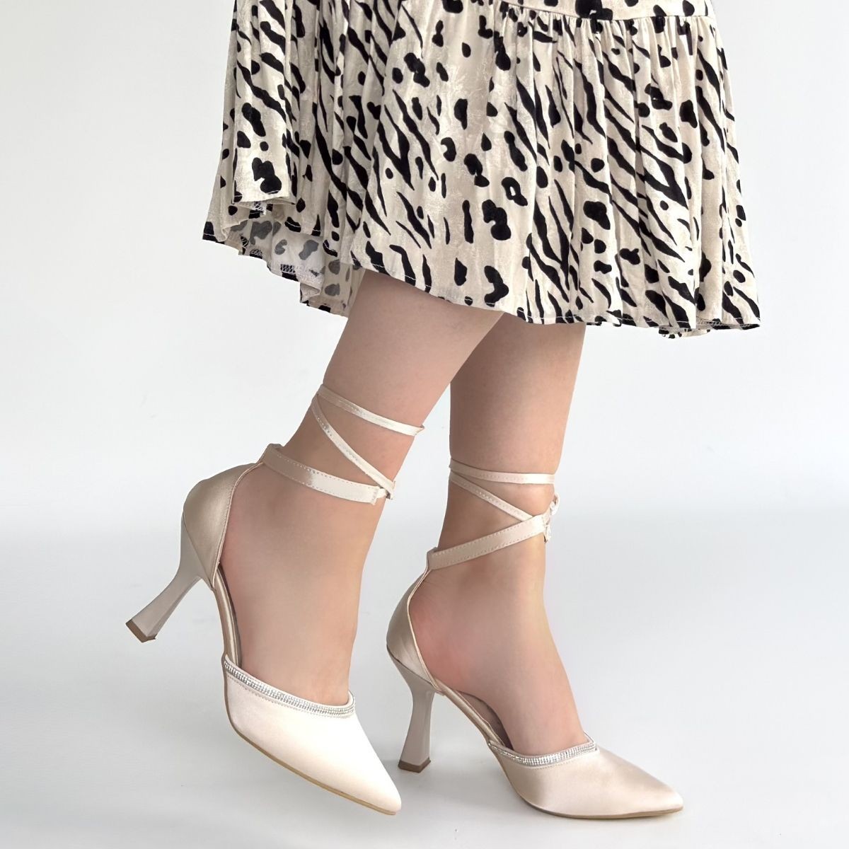 Tenja Bej Saten Bilekten Bağcıklı Topuklu Ayakkabı