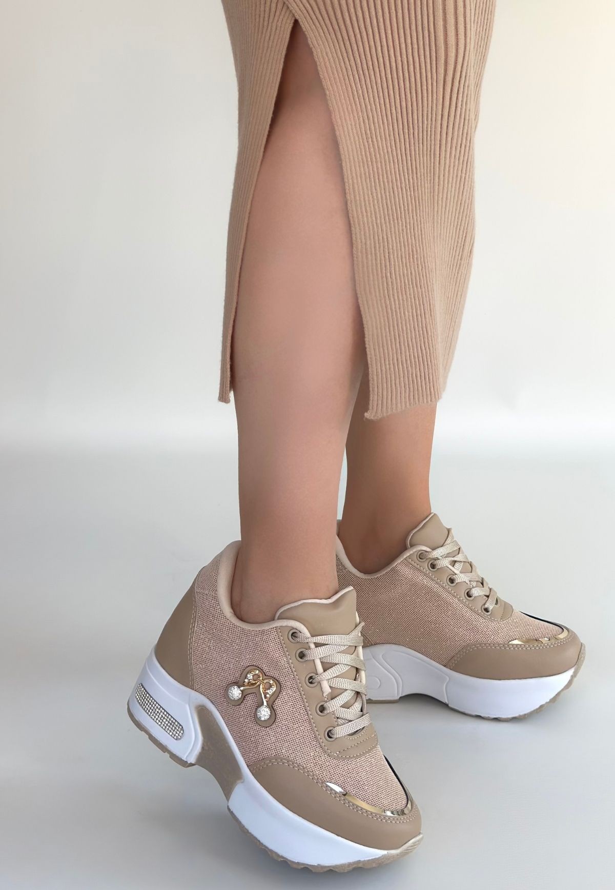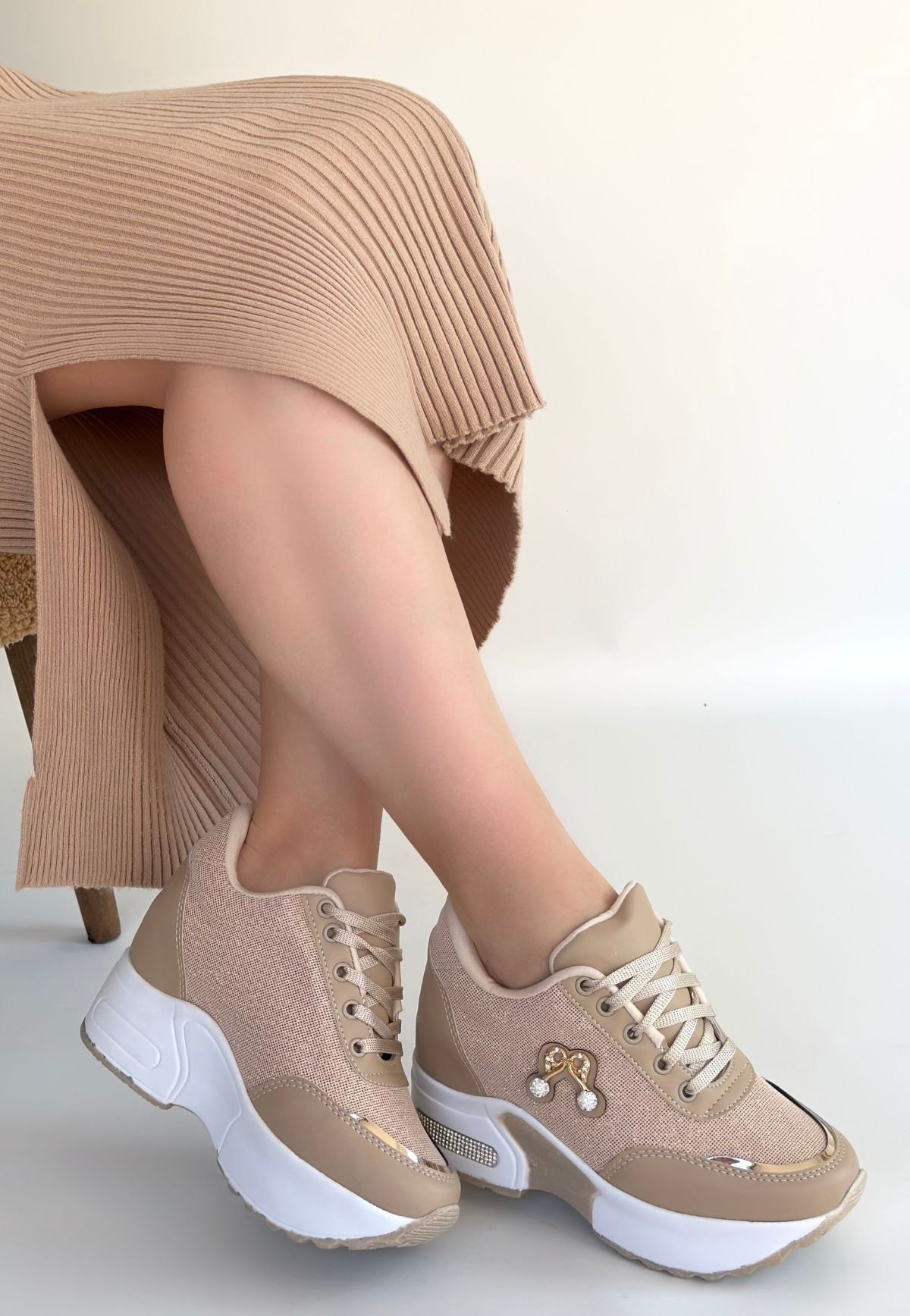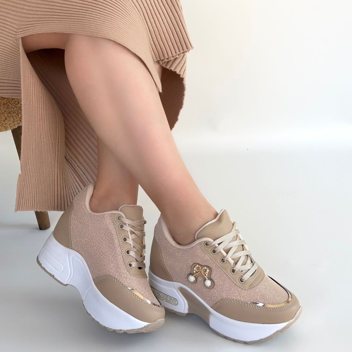 • Wody Bej Cilt Simli Bağcıklı Spor Ayakkabı